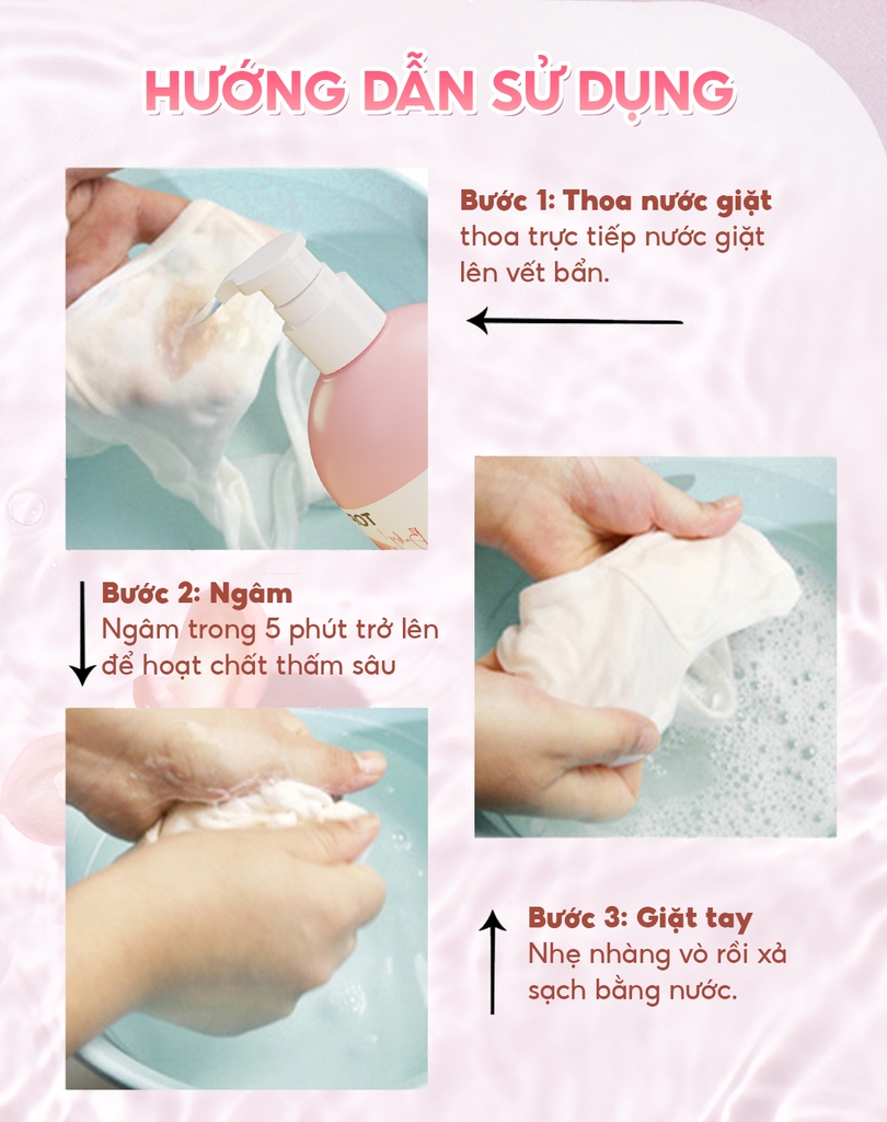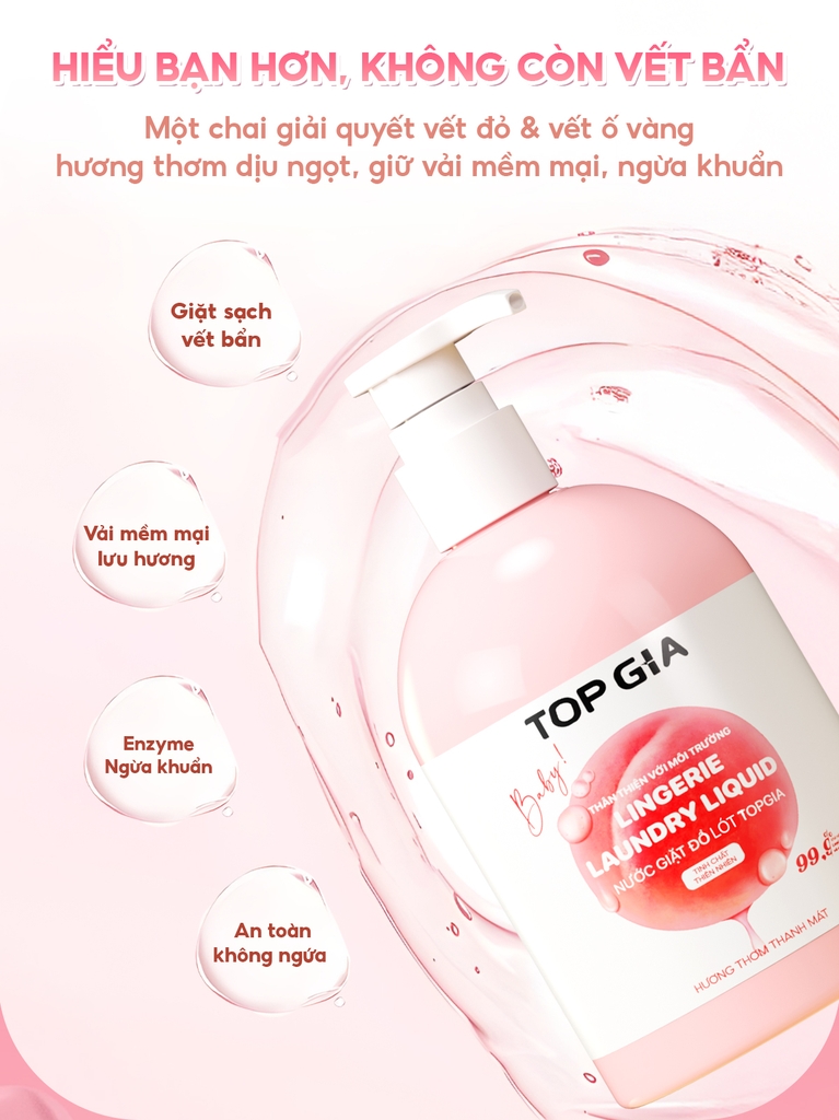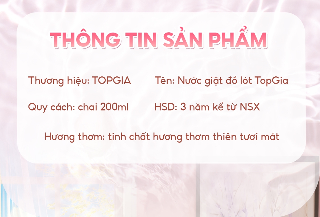 3. HƯỚNG DẪN SỬ DỤNG - Cách 1 - Giặt trực tiếp : Vò đồ lót trực tiếp với nước giặt đồ lót Topgia, xả lại với nước giặt - Cách 2 - Giặt ngâm : Làm ướt đồ lít, cho trực tiếp nước giặt đồ lót Topgia lên vết bẩn, để khoảng 5 phút, sau đó vò và giặt sạch với nước - Lưu ý : Không sử dụng nếu mẫn cảm với bất kỳ thành phần nào của sản phẩm. Ngưng sử dụng nếu có các dấu hiệu kích ứng
