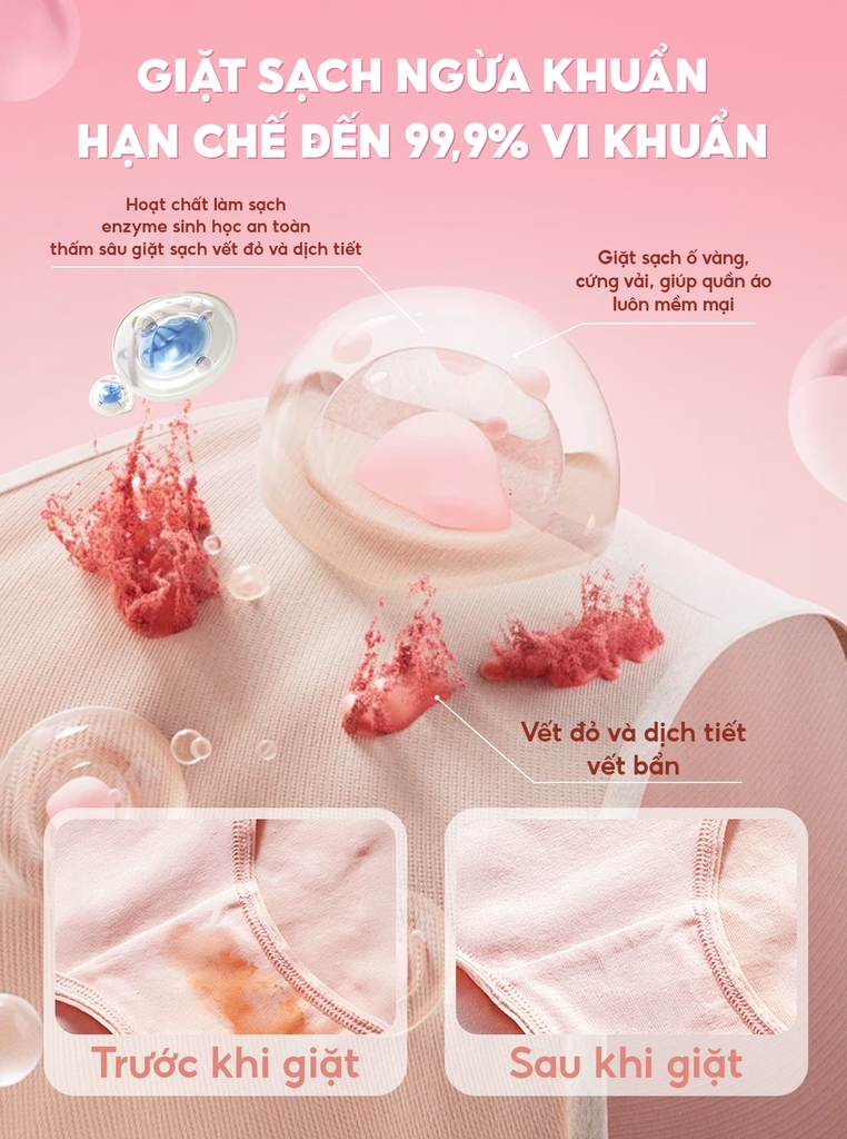 2. CÔNG DỤNG - Công thức kháng khuẩn vượt trội – Loại bỏ vi khuẩn, nấm mốc, bảo vệ sức khỏe vùng da nhạy cảm. Làm sạch tất cả từ vết đỏ của mùa dâu rụng, dịch hàng ngày, dịch bà bầu, cho con bú… đều được làm sạch nhẹ nhàng chỉ sau vài phút - Độ pH trung tính phù hợp – Dịu nhẹ, không gây kích ứng, giữ sợi vải mềm mại. - Không chứa hóa chất gây hại – Không paraben, không chất tẩy mạnh, an toàn khi giặt tay. - Hương thơm tươi mát – Tinh chất hương tràm trà lưu lại hương thơm dịu nhẹ, khử mùi, bạn sẽ cảm nhận quần thật sự sạch tinh tươm. - Dạng chai nhỏ gọn 520ml – Dễ dàng sử dụng, tiện lợi mang theo khi du lịch.